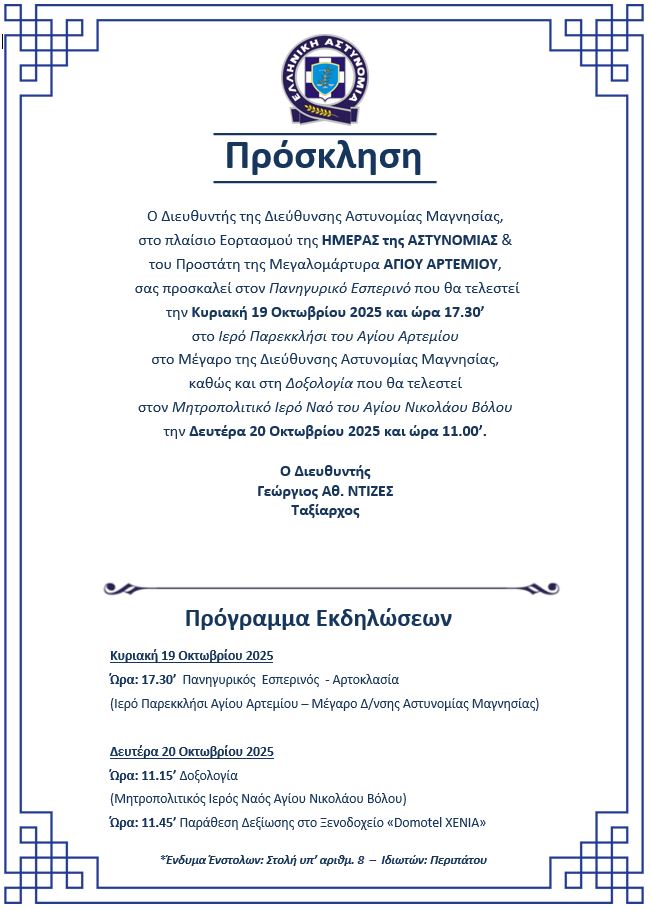 Θα τελεστεί Πανηγυρικός Εσπερινός μετά Αρτοκλασίας και Θείου Κηρύγματος, από τον Αρχιμανδρίτη Σεραφείμ Κοντάκτση, στο Ιερό Παρεκκλήσιο του Αγίου Αρτεμίου, στον προαύλιο χώρο του Αστυνομικού Μεγάρου. -