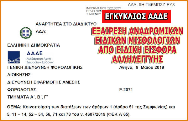Η κοινοποίηση της διάταξης για την απαλλαγή των αναδρομικών των ειδικών μισθολογίων από την ειδική εισφορά αλληλεγγύης έγινε με την υπ’ αριθμόν 2071/2019 εγκύκλιο που εξέδωσε ο διοικητής της ΑΑΔΕ Γ. Πιτσιλής στις 9 Μαΐου (σελίδα 12). Σύμφωνα με τα όσα αναφέρονται, μεταξύ πολλών άλλων, στη συγκεκριμένη εγκύκλιο: